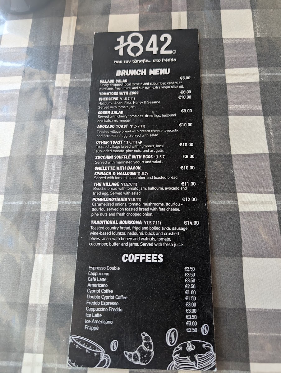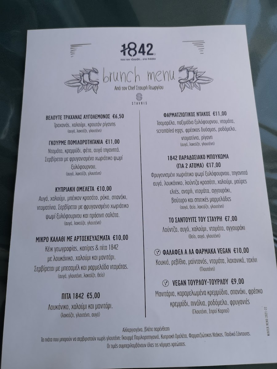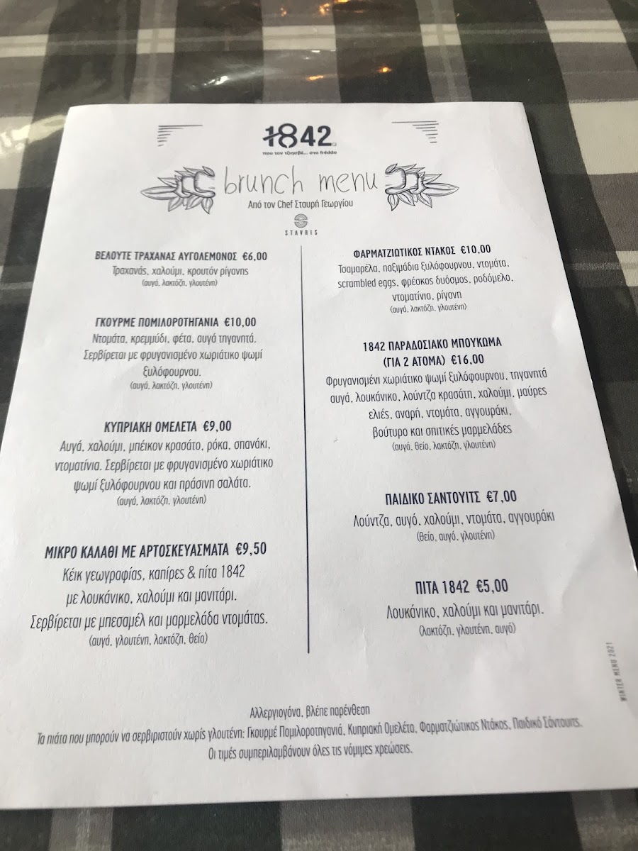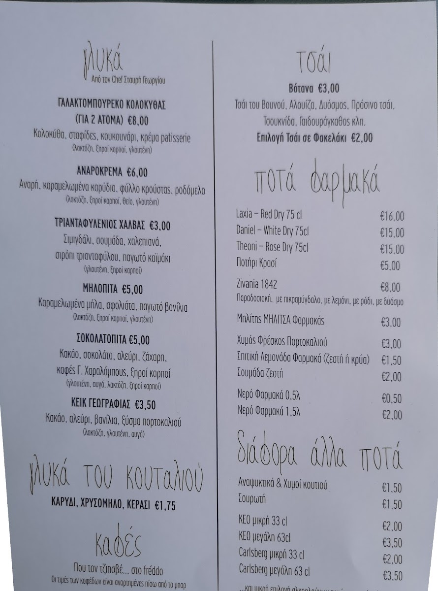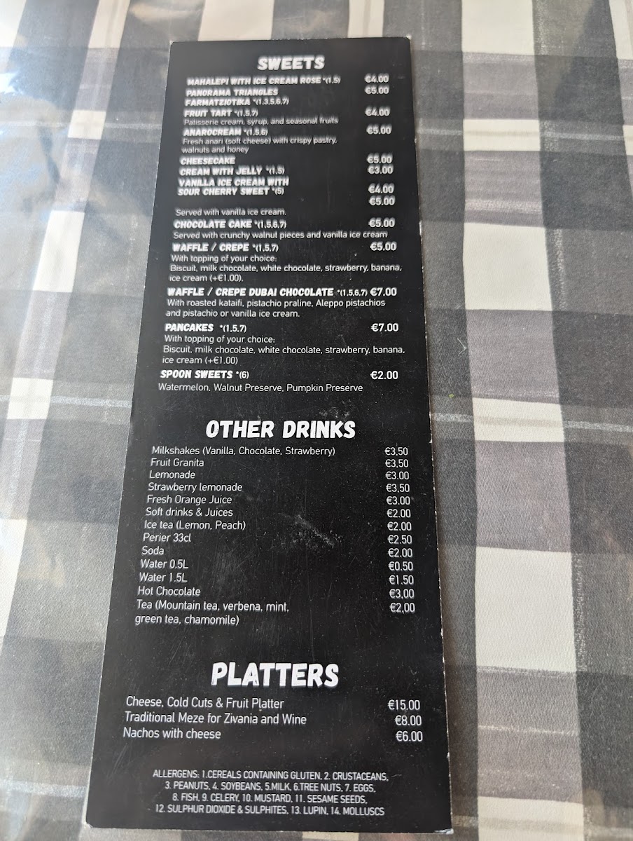 The menu offers a selection of food and drink items suited for cafe and brunch settings. It includes traditional Cypriot and breakfast options such as Cheese Pie, Παραδοσιακό Μπουκωμα (Traditional Snack), Omelettes, and pancakes with cream. Desserts like the Orange Pie of the Day served with ice cream are also available, alongside specialty items such as Machalepi.