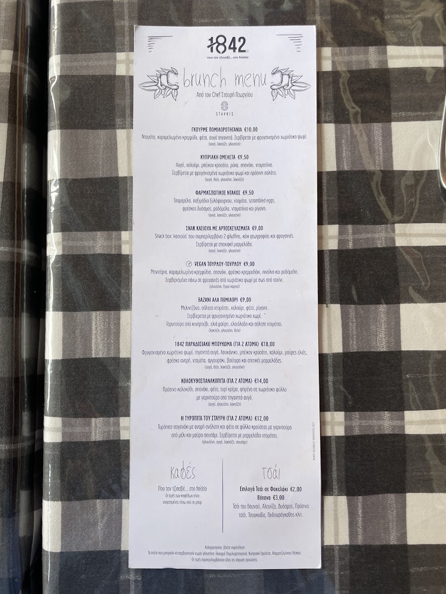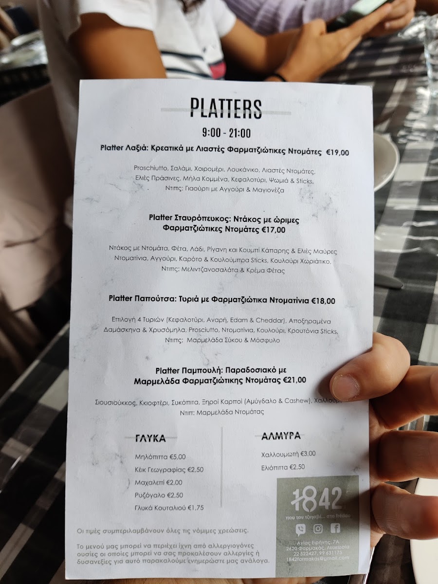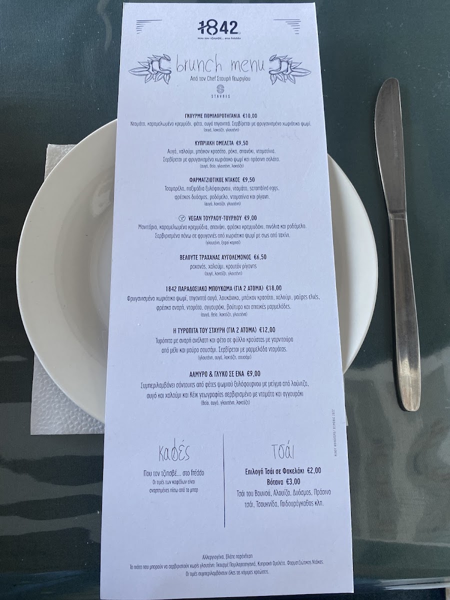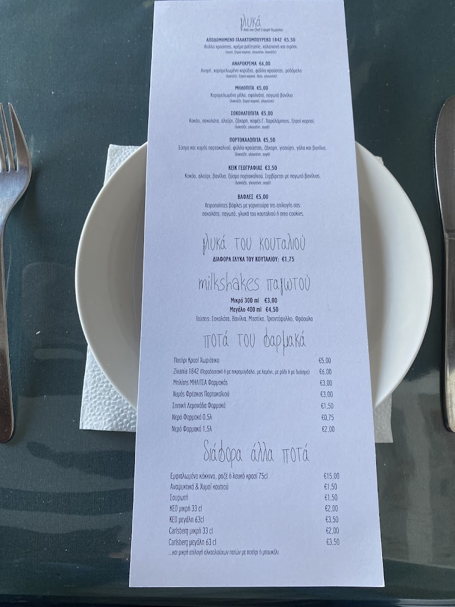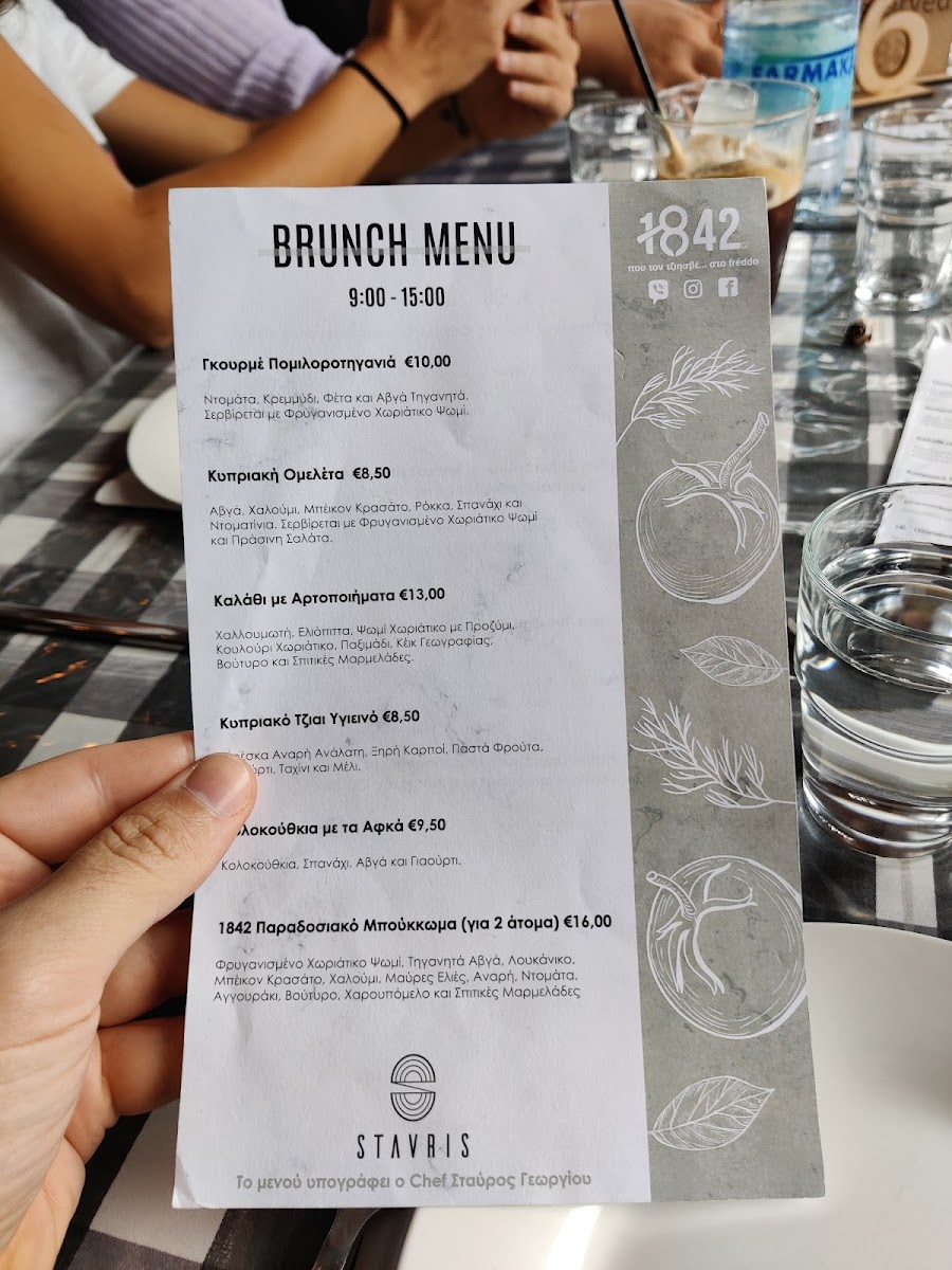 The menu offers a selection of food and drink items suited for cafe and brunch settings. It includes traditional Cypriot and breakfast options such as Cheese Pie, Παραδοσιακό Μπουκωμα (Traditional Snack), Omelettes, and pancakes with cream. Desserts like the Orange Pie of the Day served with ice cream are also available, alongside specialty items such as Machalepi.
